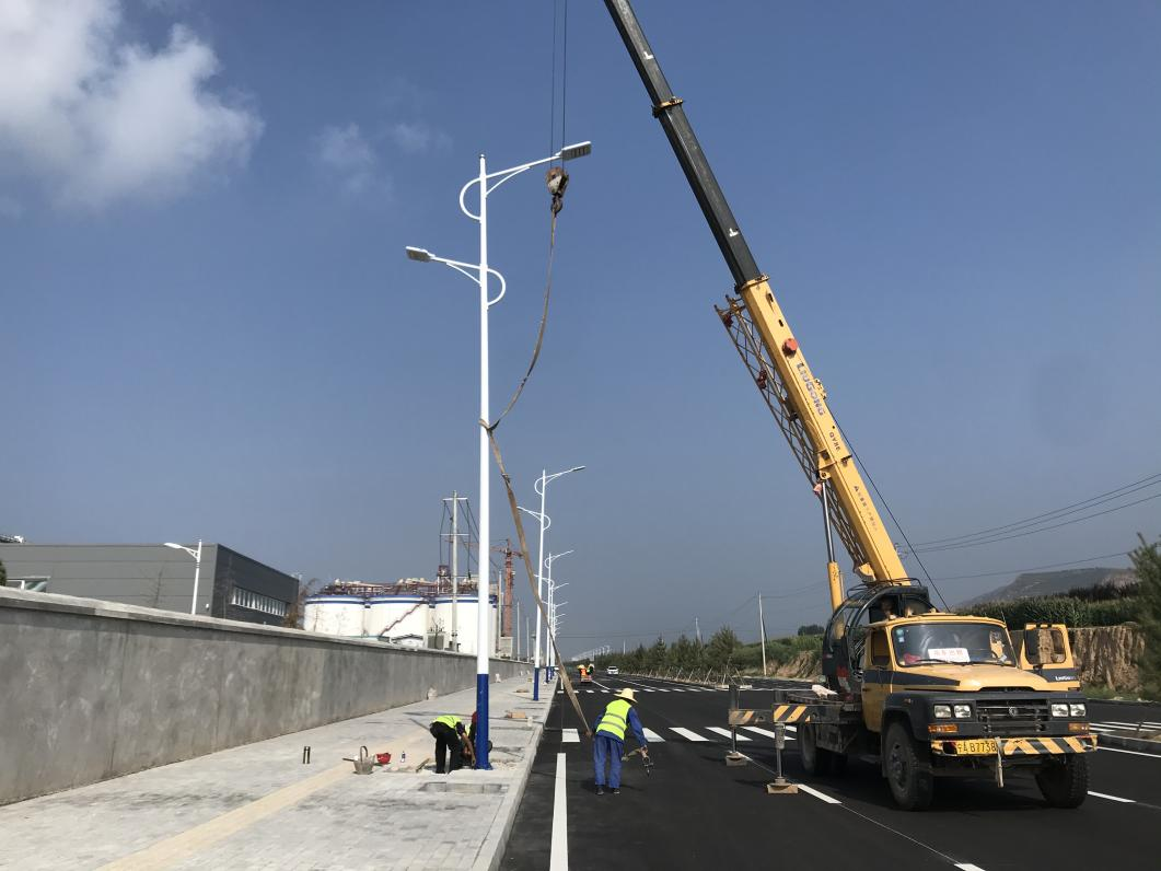 2022-08-11為了使平?jīng)龉I(yè)園區(qū)北大路(汽修路-泓源東路段)照明工程按期交付使用,宜浩園林公司增加施工人員,加大施工設(shè)備投入,不懼連日高溫天氣,加班加點的進行基礎(chǔ)澆筑、燈頭安裝及路燈吊裝等工作,力爭早日完成安裝,達到運行條件。項目由宜浩園林公司負責(zé)實施,道路全長2