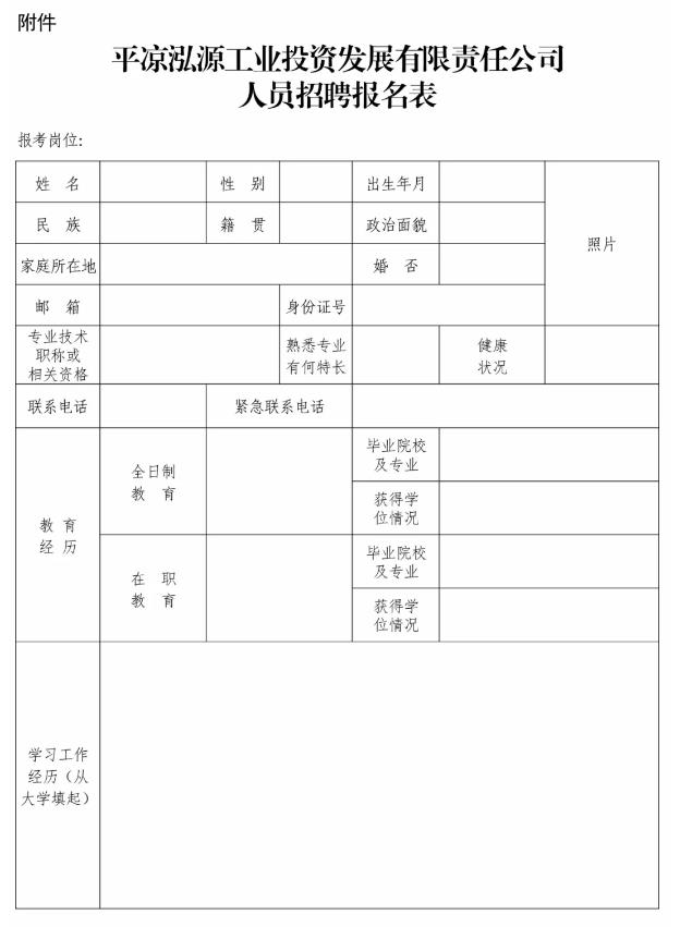 平?jīng)鲢垂I(yè)投資發(fā)展有限責(zé)任公司招聘公告