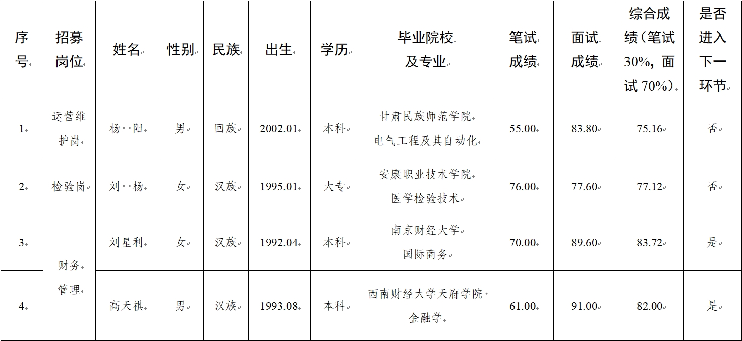 2025-07-19根據(jù)《人員招聘方案》,在組織報名、資格審查的基礎(chǔ)上,按程序完成了筆試、面試工作,現(xiàn)將筆試、面試成績公示如下:平?jīng)鍪谢A(chǔ)產(chǎn)業(yè)投資集團有限公司組織人事部? ? ?2025年7月19日? ? ?